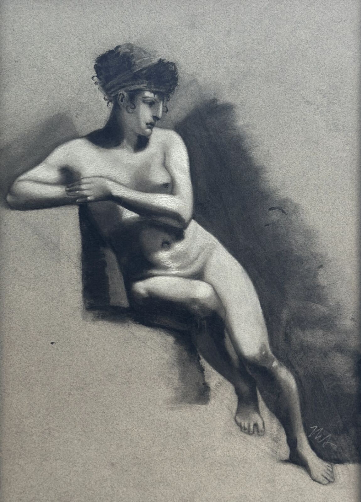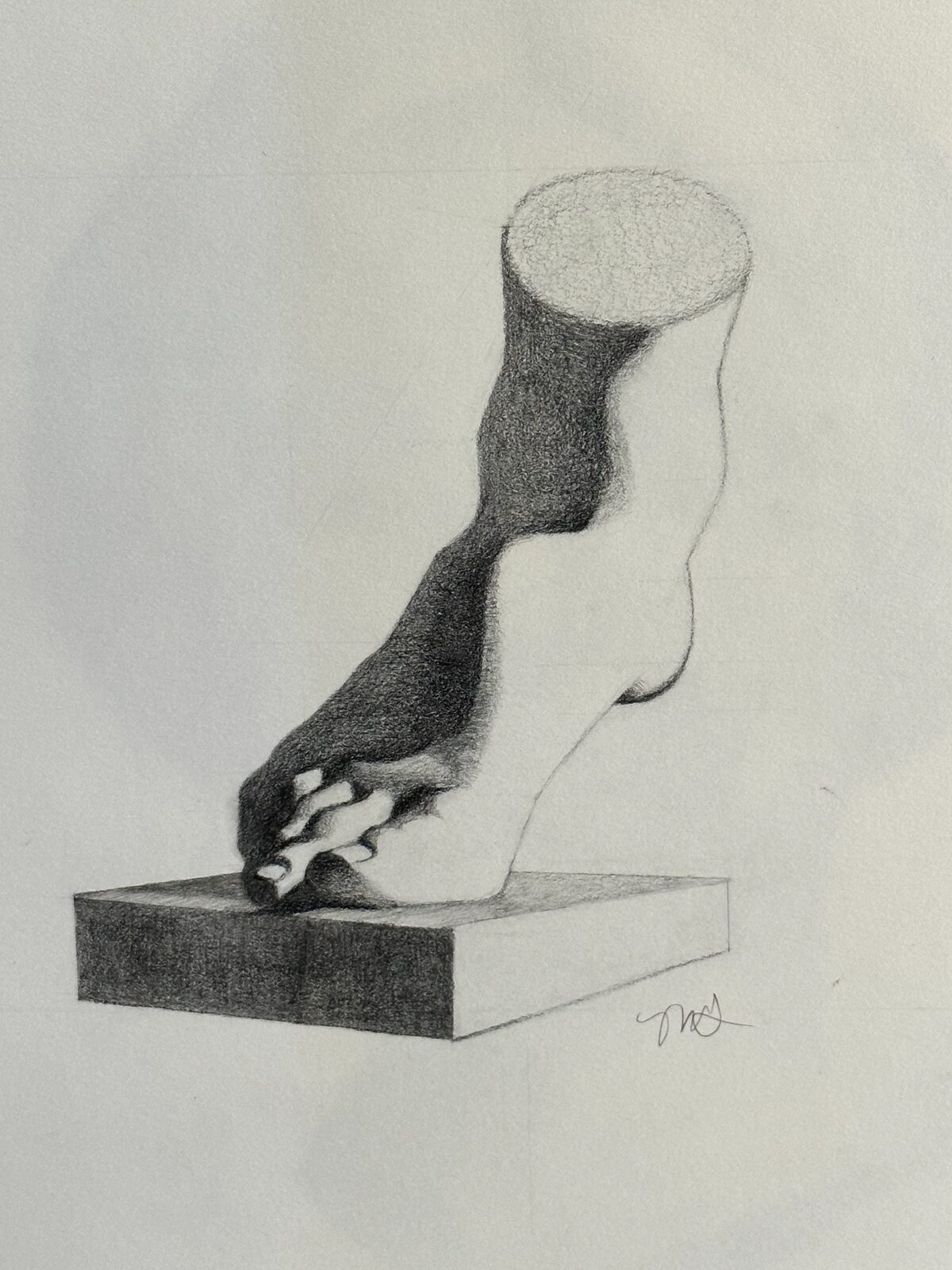 Graphite studies from the cast — foot and figure — built up slowly through observation, measurement, and a long stay with the subject.